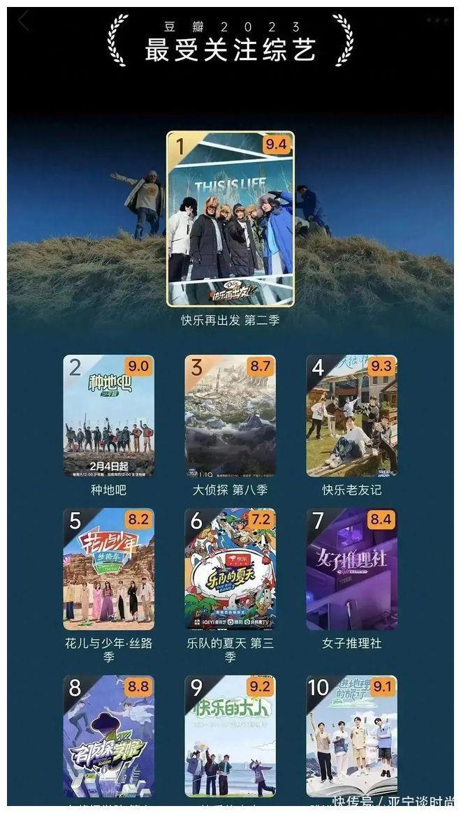 2023年豆瓣最受关注综艺榜单中,再服务男团占据两档,《欢乐老友记》和《欢乐再启程2》。而这份榜单里《花儿与少年·丝路季》《欢乐的大东谈主》《跳进地舆书的旅行》等相通可以归结于“熟东谈主综艺”——2023最大的综艺风口。